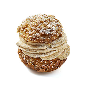 Crème mousseline pralinée, cœur coulant praliné, éclats de noisettes caramélisées